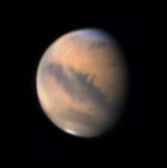 Norden gibt es zusätzlich auch leichten Dunst nahe des Morgen-Terminators. Am Abend-Terminator sieht man bei Syrtis Major eine