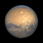 Der kleine dunkle Fleck nördlich der Wolke ist übrigens Olympus Mons – der größte bekannte Vulkan im Sonnensystem.