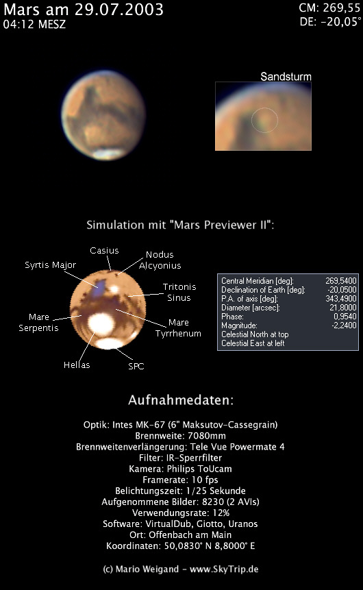 Kommentar: Ein kleines Highlight dieser Opposition ist an der nordöstlichen Ecke von Syrtis Major zu erkennen: ein Sandsturm, zeigt sich als heller beige-gelber Fleck.