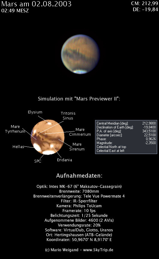 : Im Norden sind Einzelheiten der Elysium-Region erkennbar. Inmitten der dunklen Strukturen ist möglicherweise schwach der große Schildvulkan Elysium Mons zu sehen. Sehr auffällig sind die zwei dunklen