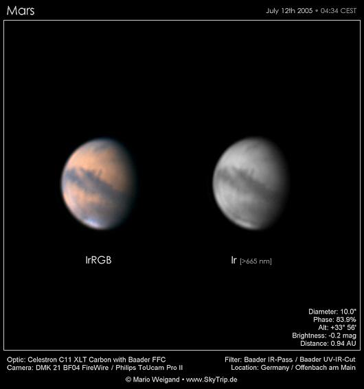 Kommentar: An diesem Morgen war das Seeing in manchen Momenten recht gut, sodass der Detailgrad sehr zufriedenstellend ist, für die aktuellen Bedingungen. Auffällig, ist, dass die südliche Polkappe stark geschmolzen ist, auf der Aufnahme vom 20. Juni war sie noch wesentlich prominenter.