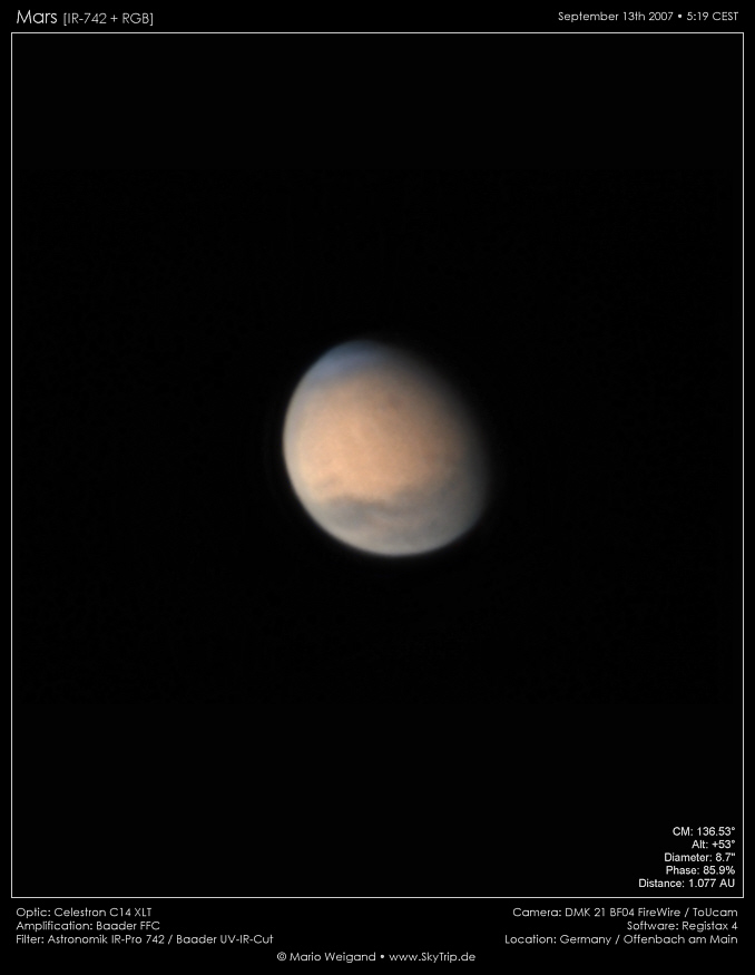 Kommentar: Am 13. September gab es in den Morgenstunden recht gutes Seeing. Sichtbar, auch visuell im Bino war Olympus Mons,