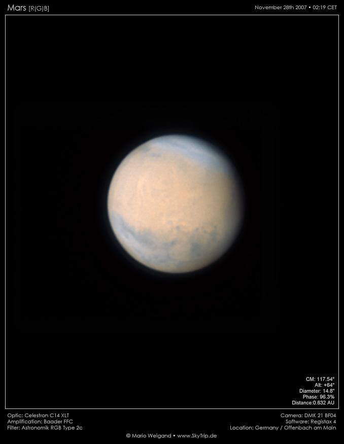 Kommentar: Fast genau eine Stunde später war das Seeing nochmal etwas besser und es entstand eine zweite Sequenz. Die Strukturen in den hellen Regionen von Tharsis bis Amazonis zeigen sich hier deutlicher. Mare Sirenum und Mare Erythraeum erscheinen leicht dunstig.