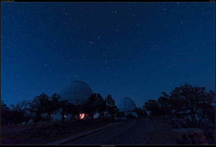 : Ursa Major über den Kuppeln des Otto Stuve Teleskops (vorne) und des Harlan J. Smith Teleskops (hinten) am McDonald Observatorium in Texas. Die Kuppeln befinden sich auf dem Gipfel des Mount Locke.