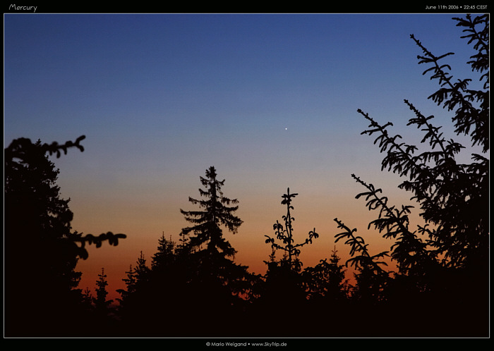: Merkur in der Abenddämmerung des 11. Juni 2006 gegen 22:45 Uhr knapp über den Tannenspitzen auf dem Sandplacken im Taunus.