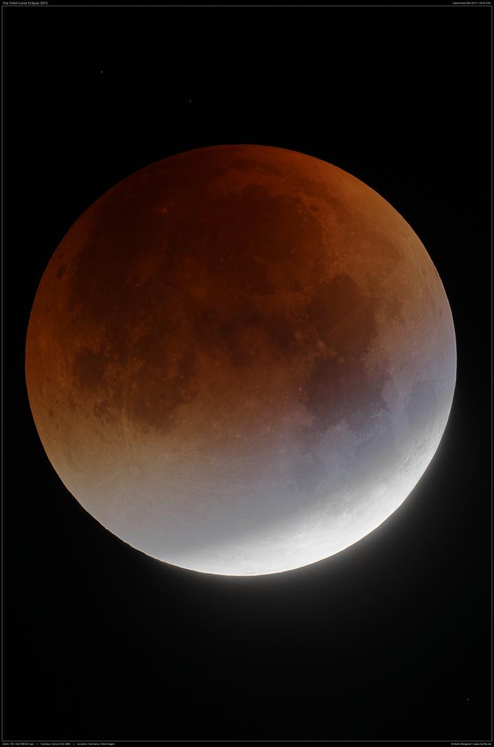 Kommentar: (03:59 MESZ) Ein HDR-Komposit des fast voll verfinsterten Mondes.