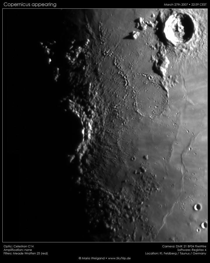 : Mondkrater Kopernikus taucht am Terminator des zunehmenden Mondes auf. Leider gab es kein richtig gutes Seeing, für kürzere Brennweiten reichte es aber noch. Also habe ich die Szene bei geringerer Vergrößerung festgehalten.