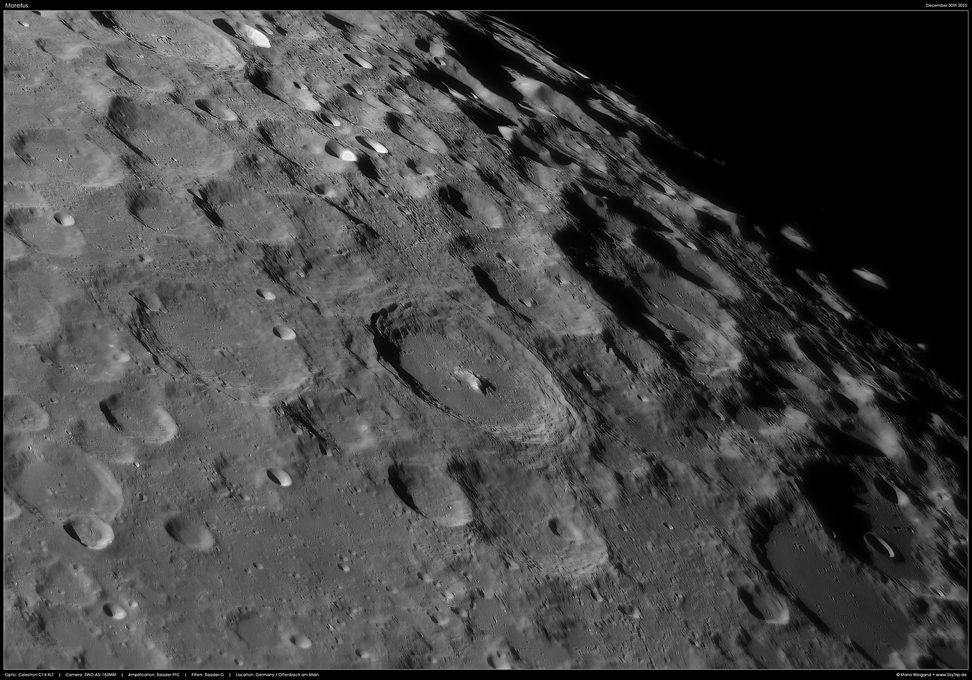 Kommentar: Moretus ist ein eindrucksvoller, 117 km großer Krater im südlichen Hochland und recht nahe am Südpol des Mondes.