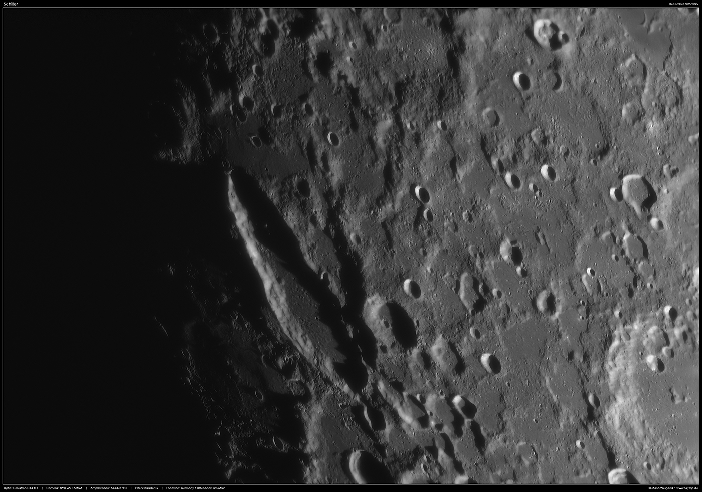 Kommentar: Einer der bemerkenswertesen Mondkrater ist der langestreckte Krater Schiller. Seine Wallkontour ähnelt einem Schuhabdruck.