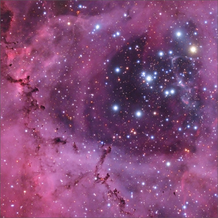 der auch als Rosettennebel bekannt ist. Er nimmt am Himmel eine Fläche von rund 60x80 Bogenminuten ein.