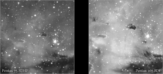 Ein Remake des Pacman-Nebels in H-Alpha. Der 105er Pentax liefert einen erkennbar höheren Detailgrad als der 75 SDHF.