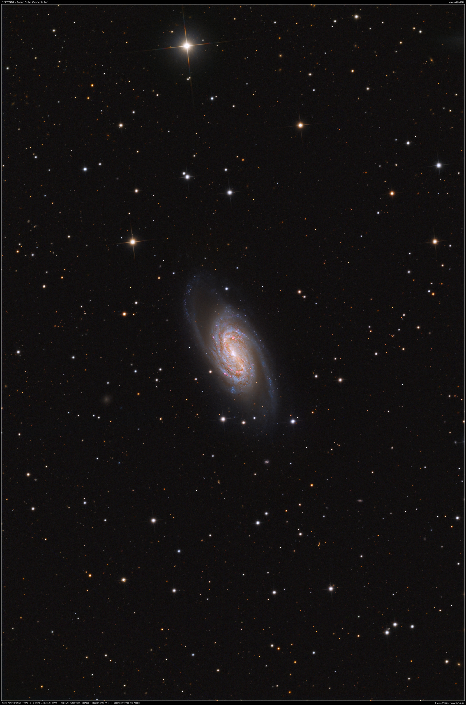 Kommentar: NGC 2903 ist eine Balkenspiralgalaxie im Sternbild Löwe, die etwa 1,5° südlich von Lambda Leonis liegt.