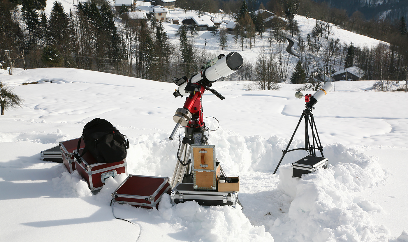 - Daher gilt bei mobiler Astrofotografie im Winter: An den drei Positionen der Stativfüße sollte so gut wie möglich der Schnee entfernt und auf stabilen Untergrund geachtet werden.