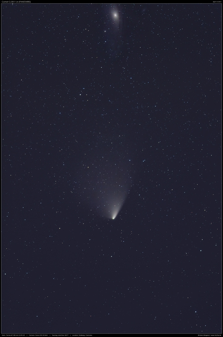 : Hier ist noch eine zweite Ansicht des Kometen L4 PANSTARRS vom 1. April, aufgenommen bei 300 mm Brennweite. M31 ist am oberen Bildrand zu sehen. Der Abstand wird am 2. April sich noch weiter verringern.