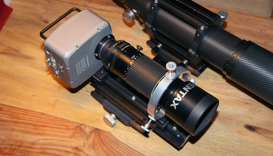 Das Pentax M* 300 mm ED (IF) für das Pentax67-System ist ein Mittelformat Teleobjektiv, das sehr gut für die Astrofotografie geeignet ist. Selbst bei Vollformat-Sensoren liefert es bei Blende 4 eine sehr gute Sternabbildung bis in die Ecken. Der Anschluss erfolgt über einen Canon EOS-Adapter für die SBIG STL-Serie und einen Adapter von Pentax 67 Bajonett auf den EOS-Anschluss. Die Streulichtblende ist abnehmbar.