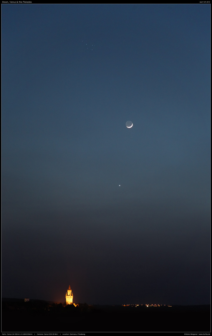 Kommentar: Für Mitte April stand die schönste Konstellation des Jahres 2010 an. Merkur tief am Horizont, darüber die helle Venus zusammen mit der dünnen Mondsichel und noch ein Stück weiter oben die Plejaden. Wäre der dichte Zirrus am Horizont nicht gewesen, hätte es auch Merkur geschafft...