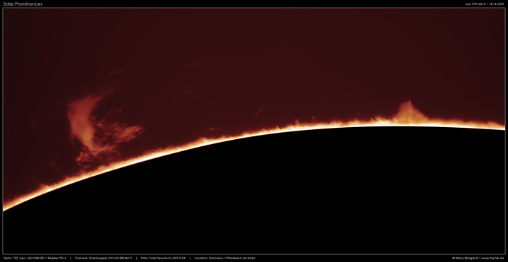 Kommentar: Anfang Juli 2014 war auch der Sonne recht viel Aktivität zu beobachten, jedoch spielte das Wetter nicht mit. In der dritten Juliwoche ist die Fleckenaktivität sehr plötzlich stark abgefallen und auf der Oberfläche war fast fleckenfrei. Jedoch waren am Sonnenrand recht imposante, große Protuberanzen zu finden.