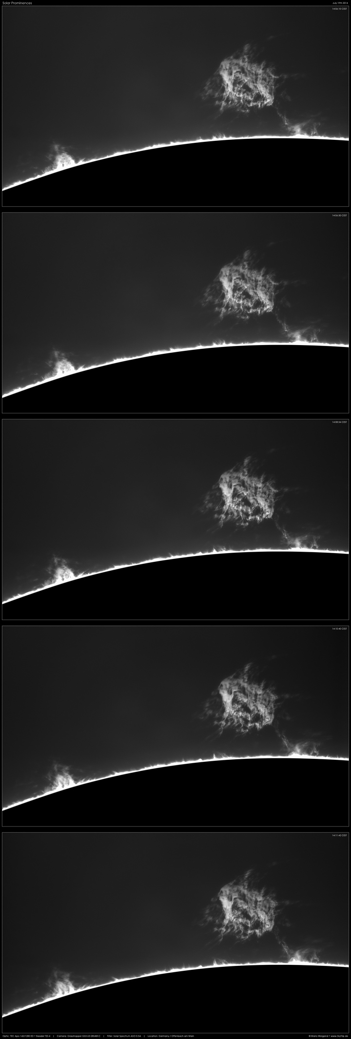 Kommentar: Anfang Juli 2014 war auch der Sonne recht viel Aktivität zu beobachten, jedoch spielte das Wetter nicht mit. In der dritten Juliwoche ist die Fleckenaktivität sehr plötzlich stark abgefallen und auf der Oberfläche war fast fleckenfrei. Jedoch waren am Sonnenrand recht imposante, große Protuberanzen zu finden.