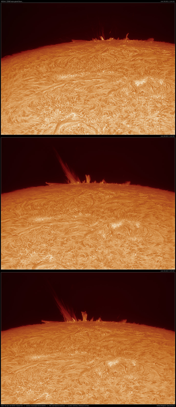 Am 15. Juni drehte sie im Weißlicht aus dem Sichtbereich. Im H-Alpha-Licht gab sie noch ein Abschiedsfeuerwerk mit interessanten Protuberanzen!