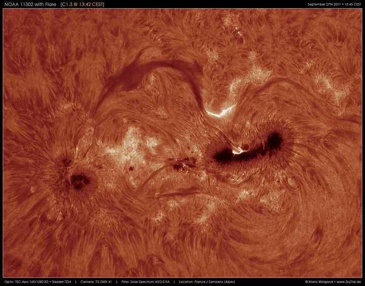 Ende September gab es wieder ein Highlight für Sonnenbeobachter. Mit NOAA 11302 trat ein echtes Schwergewicht aktiver Regionen auf die Bühne. Unter anderem konnte ich am 27. September einen Flare beobachten. Laut Active Region Monitor ging er 13:42 los, Stärke C1.3.