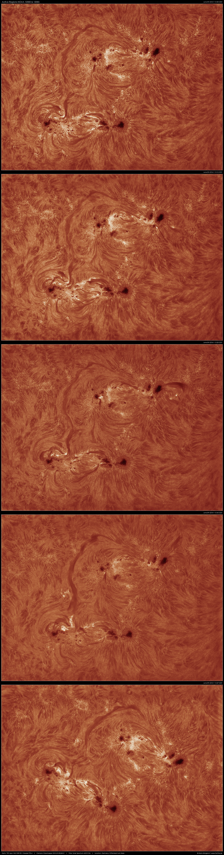 : Anfang Juni gab es zwei spannende aktive Regionen, die beide in das Gesichtsfeld meiner Grasshopper 3 Kamera passten. Diese kleine Bilderserie zeigt, wie schnell sich Strukturen in der Chromosphäre verändern können.