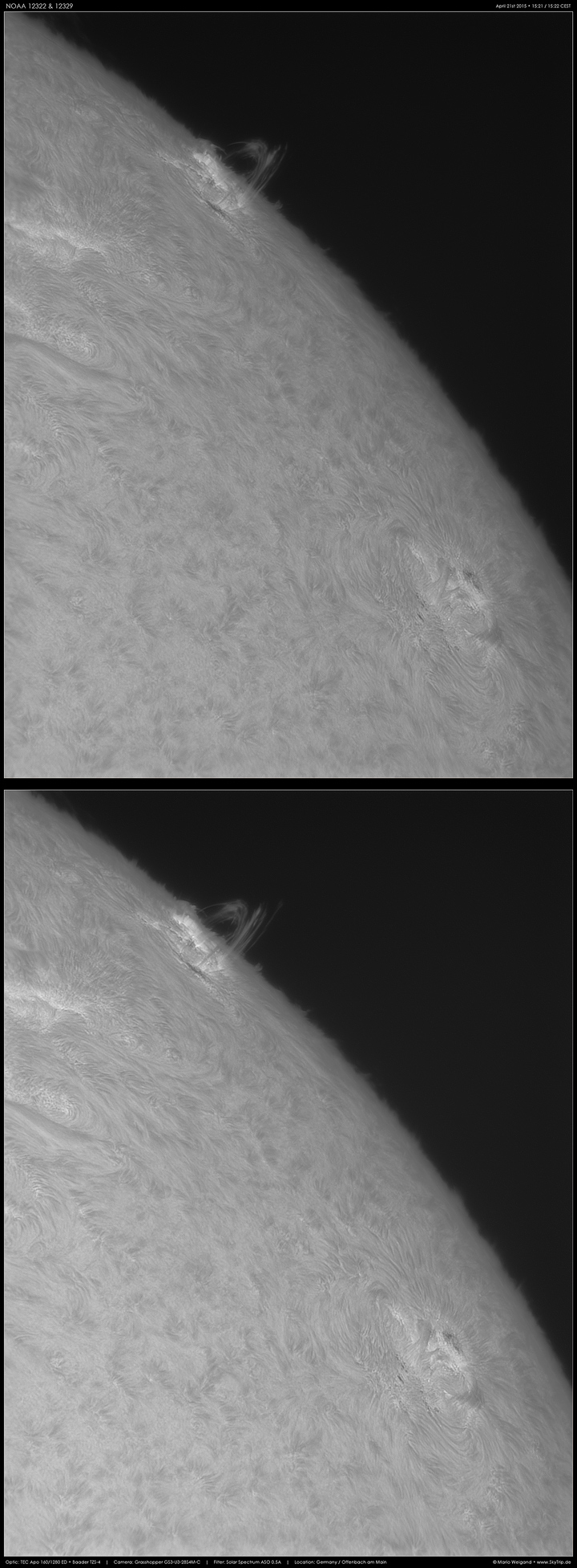 : Am 21. April 2015 standen die beiden aktiven Regionen NOAA 12322 und 12329 am Sonnenrand, wie diese Aufnahme dokumentiert. Vor allem #12322 war mit einigen Protuberanzenbögen, die sich schnell veränderten, ein echter Hingucker!
