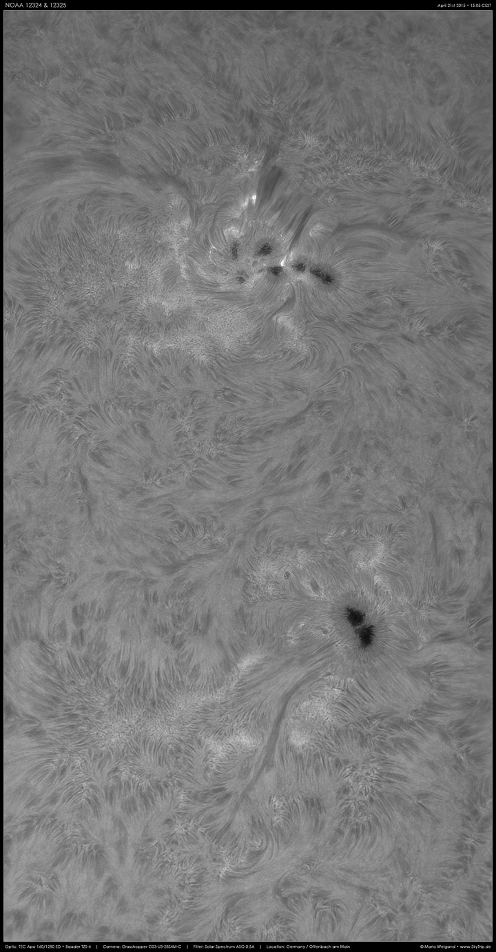 Einige schöne Fleckengruppen sind auf der Nordhemisphäre erschienen. Diese Aufnahme vom 21. April zeigt die beiden Regionen NOAA 12324 & 12325.