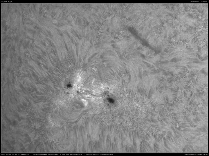 Die beste Videosequenz habe ich dennoch zu diesem Bild verarbeitet. Neben der Fleckengruppe ist oben rechts ein kleines Filament zu sehen.