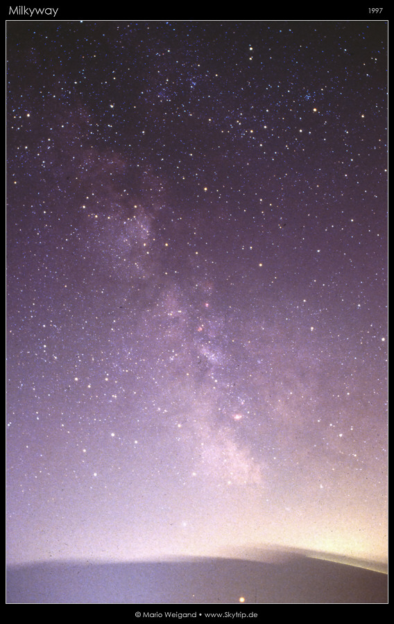 : Ein altes Dia, das beim einscannen leider nicht mehr viel hergab. Es zeigt den Schützen mit diversen Nebeln und Sternhaufen.