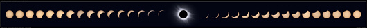 : Eine Kollage des Finsternisverlaufs aus 33 Aufnahmen. 16 Bild vom Eintritt, ein Bild der Totalität und 16 Bilder des Austritts sind enthalten.