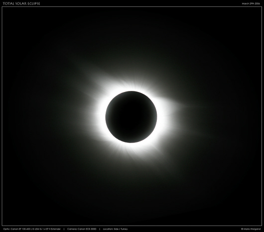 Kommentar: TOTALITÄT! Fast schlagartig wird es dunkel und die Korona erscheint in voller Pracht. Da sich die Sonne nahe ihres Aktivitätsminimums befand, waren die langen Streamer (Korona-Strahlen) elliptisch verleilt, mit nur recht kurzen Streamern an den Polen. Bei Aktivitätsmaximum sind die Streamer kreisförmig verteilt, also überall etwa gleich lang.