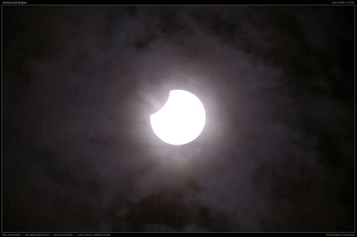 : Das erste Bild durch die Wolken, mit der EOS 5D am Orion 80/600 ED enthüllt bei Tolerierung einer überbelichteten Sonnenscheibe den Wolken-Vordergrund. Als Sonnenfilter kam Die Baader AstroSolar-Folie mit ND=3,5 zum Einsatz.