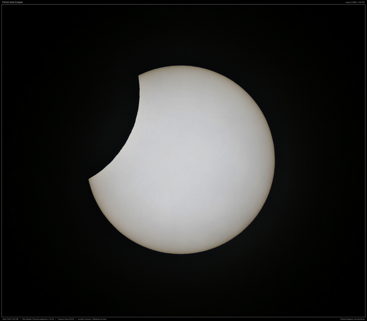 : Etwa 4 Minuten vor der maximalen Bedeckung (Frankfurt: 10,7%) gab es eine brauchbare Wolkenlücke, die einen relativ klaren Blick erlaubte. Leider waren heute, wie auch schon die Wochen vor der Finsternis, keinerlei Sonnenflecken zu sehen.