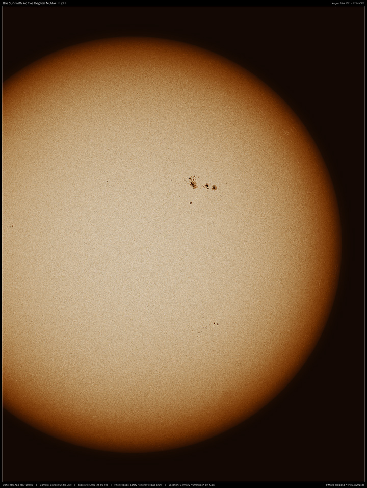 Kommentar: Mitte August 2011 war die aktive Region NOAA 11271 das dominierende Merkmal im Antlitz der Sonne, eine komplexe Fleckengruppe, die einige Ausbrüche verursachte. Am 23.08. war der Himmel nicht richtig klar, durchrauschende Wolken, Windböen und schlechte Aussichten für den Abend und den kommenden Tag. Doch trotzdem war das Seeing erstaunlich gut und es gelang eine ansprechende Aufnahme im Weißlicht mit der Canon EOS 5D Mk II am TEC 160 ED mit Herschelkeil.