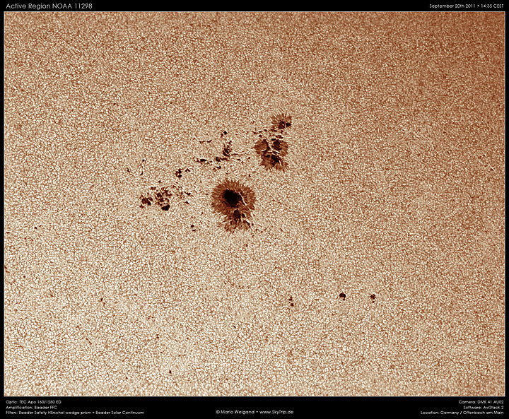 : NOAA 11298 war Mitte September 2011 die auffälligste Fleckengruppe auf der Sonne. Am 20. September ist mir diese Detail-Aufnahme im Weißlicht gelungen. Zur Zeit der Aufnahme war sie laut dem Sonnenobservatorium Kanzelhöhe eine D-Gruppe.