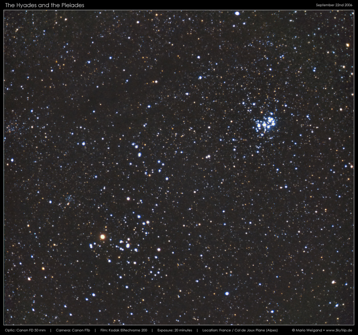 Kommentar: Das Sternbild Stier (Taurus) beherbergt einige interessante Sternhaufen und auch Nebel (letztere sind aber nicht auf der Aufnahme zu sehen). Neben den Hyaden (Melotte 25) findet man im Taurus noch den berühmten Sternhaufen der Plejaden (eng. Pleiades), auch als Siebengestirn bekannt. Sie sind Reflexionsnebeln umgeben, die schwach das blaue Licht der jungen Plejadensterne reflektieren. Zudem zeigt die Aufnahme auch noch die offenen Sternhaufen NGC 1746 und NGC 1647.