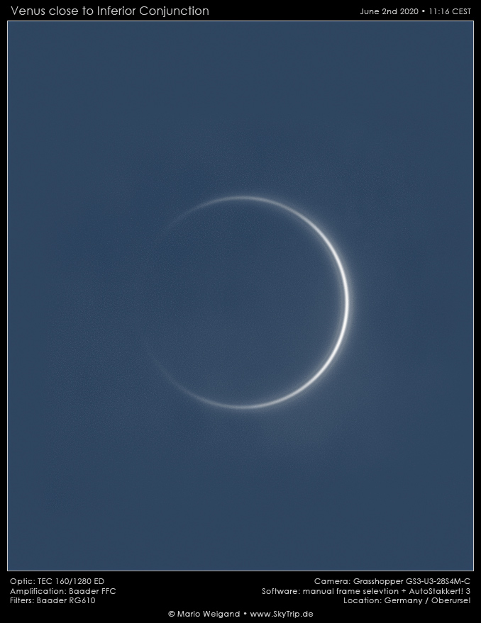 Mein letztes Bild vor der unteren Konjunktion 2020. Am 2. Juni gab es kurz vor Mittag eine Chance für Aufnahmen, kurz bevor der Zirrus zu dicht wurde.