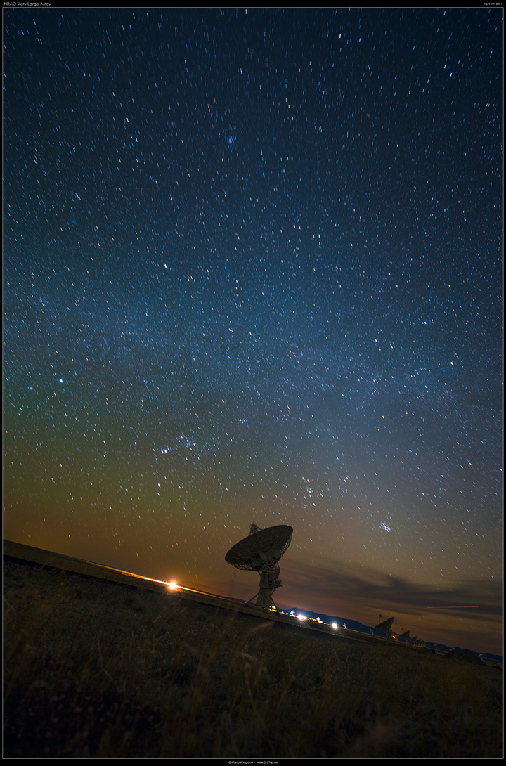 : Die Wintersternbilder mit Zodiakallicht und Airglow in der Abenddämmerung über dem NRAO Very Large Array in New Mexico.