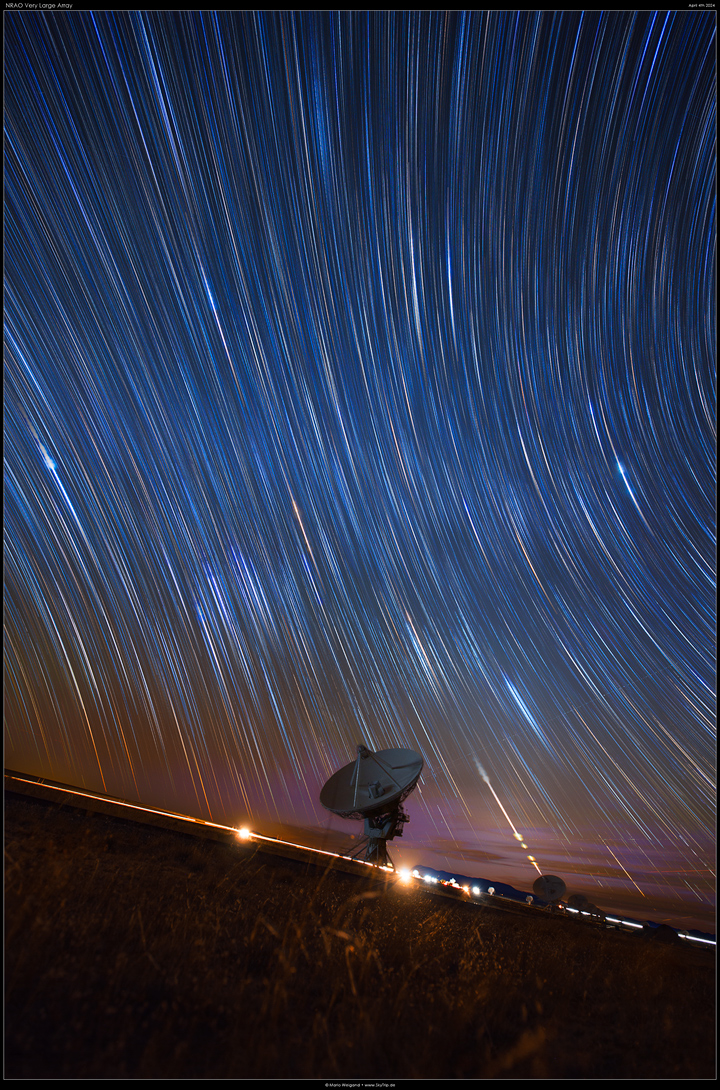 : Sterne ziehen ihre Spuren über dem NRAO Very Large Array in New Mexico. Hier ist noch eine andere Bearbeitung mit ein- und ausgeblendeten Strichspuren.