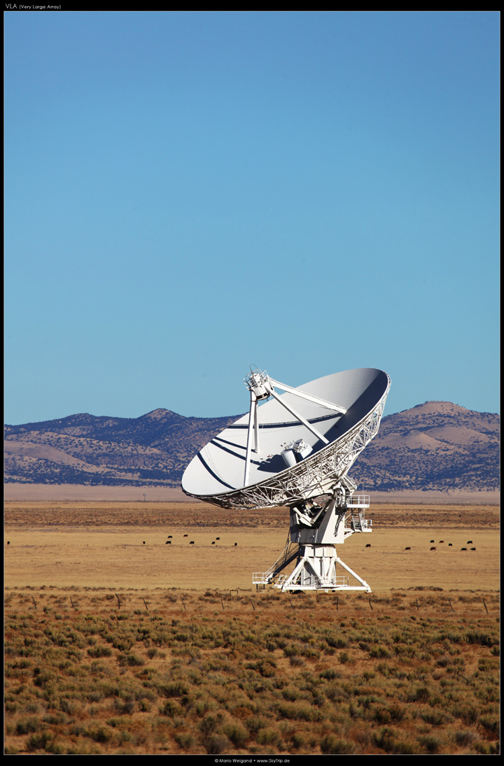Kommentar: Eines der Teleskope vor der großartigen weiten San Augustin-Ebene. In der Gegend ist außer Ranch-Geländen mit ein paar Rindern und der kleinen Stadt Magdalena sonst nicht viel von Menschen geschaffenes zu finden. Im Hintergrund sind die Gallinas Mountains zu sehen.
