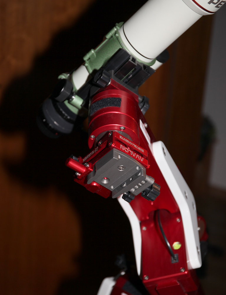 Die italienische Montierungsschmiede Avalon Instruments bietet mit dem X-Guider eine verstellbare Montagemechanik zur Parallelmontage einer zweiten Optik an, die dem 10Micron Stronghold ähnelt. Ich verwende den X-Guider an der Avalon M-Zero Montierung. Über eine Prismenklemme für das GP-Format kann sehr einfach ein kleines Leitrohr montiert werden. Durch die Einstellmöglichkeiten sind Letrohrschellen oder Exzenter unnötig.